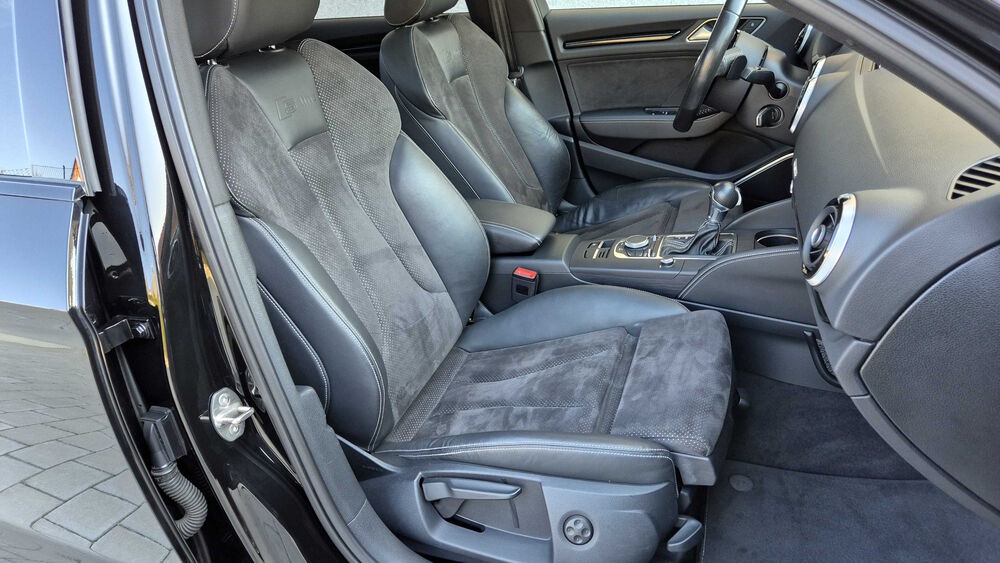 Interieur: S-LINE, Sportsitze Leder/Alcantara schwarz gelocht, Dekoreinlagen in 3D-Optik schwarz , Dachhimmel schwarz