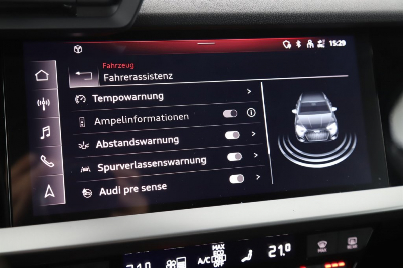 Modell INTENSE DIGITALES COCKPITLED-Scheinwerfer, Navigationssystem, VIRTUAL Cockpit, 2-Zonen-Klimaautomatik, Sitzheizung, Aussenspiegel elektrisch beheizbar, Lichtautomatik, Ledermultifunktionslenkrad, Schaltwippen, Tempomat, Abstandstempomat, Bluetooth-Telefonie, Touchdisplay, Audi-Drive-Select, USB-Schnittstelle, Beifahrerairbag abschaltbar, 16 Zoll Alufelgen, Met.Lack