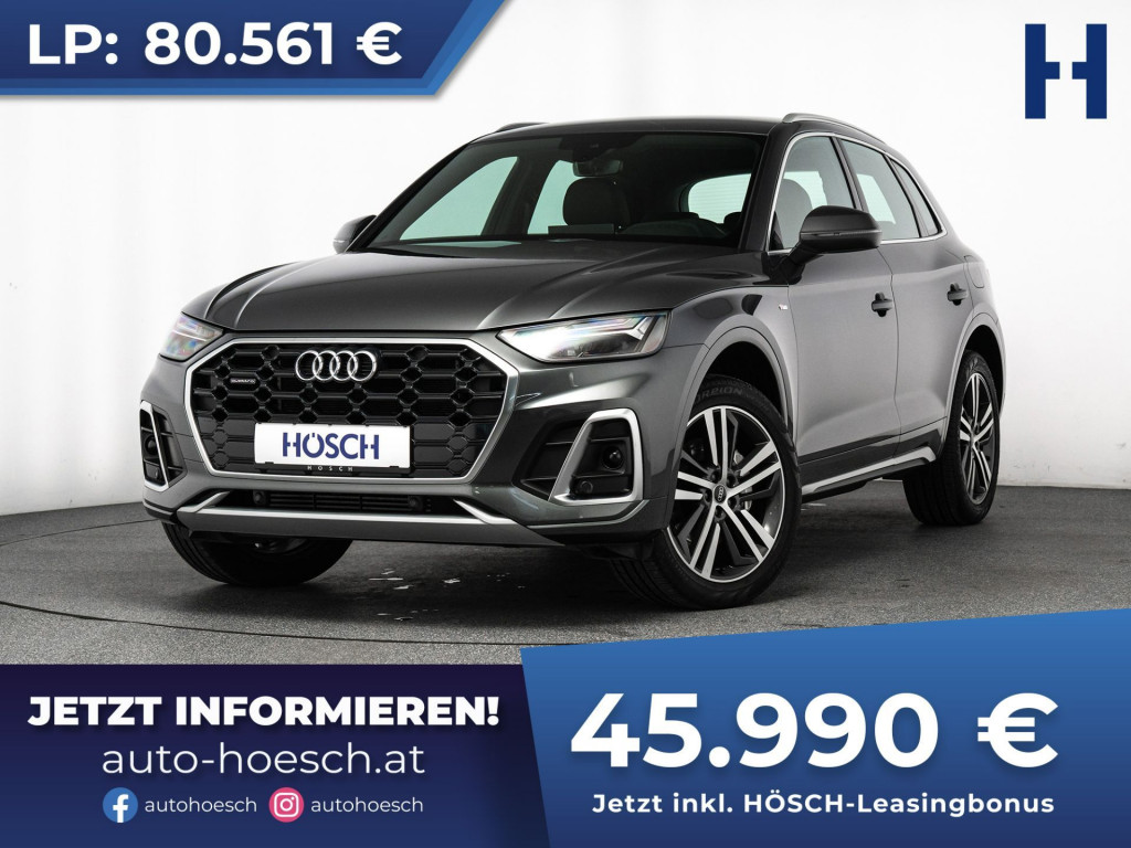 Sparsam, Leistungsstark und zugleich Sportlich dank 2x S Line. Audi Q5 55 TFSI e quattro S Line mit umwerfender Ausstattung zum HÖSCH-Bestpreis.Preis inkl. HÖSCH-Leasingbonus: 45.990 €