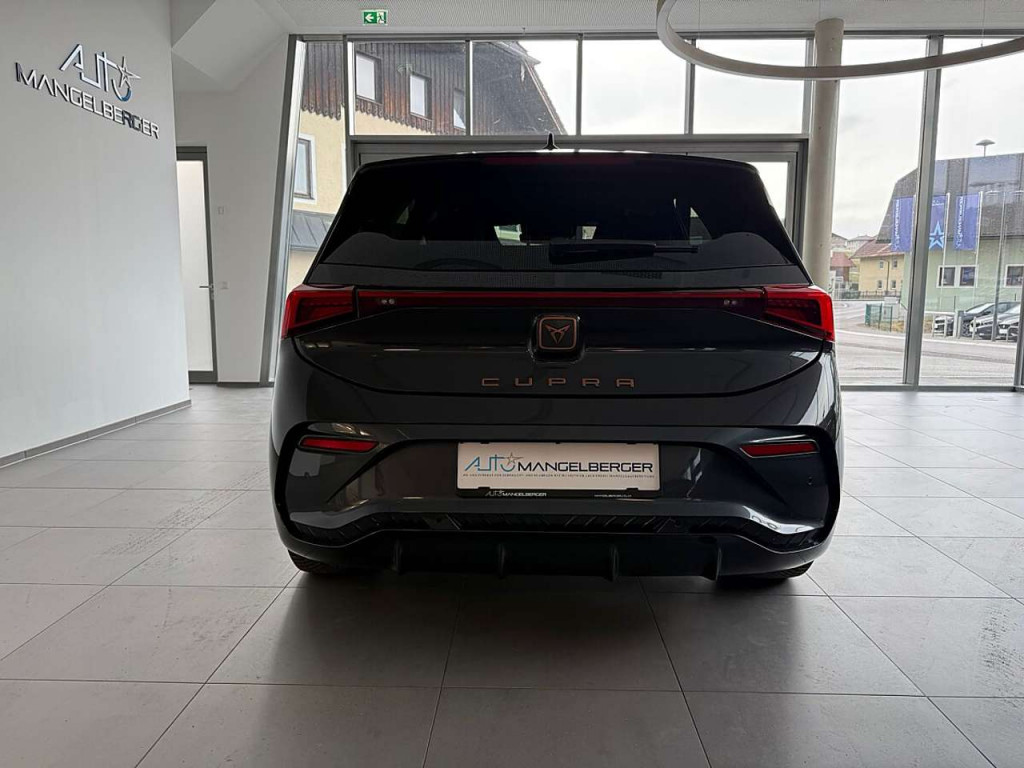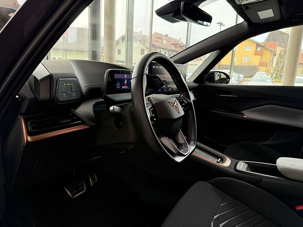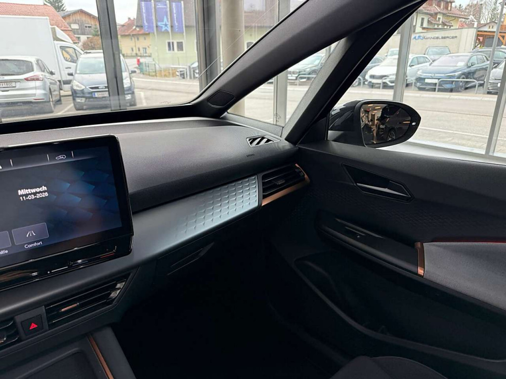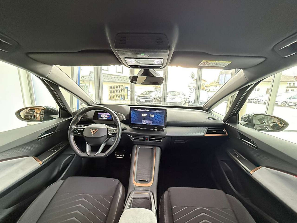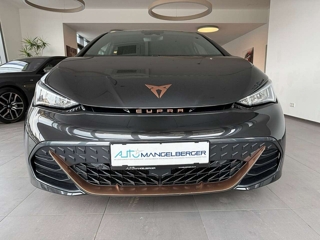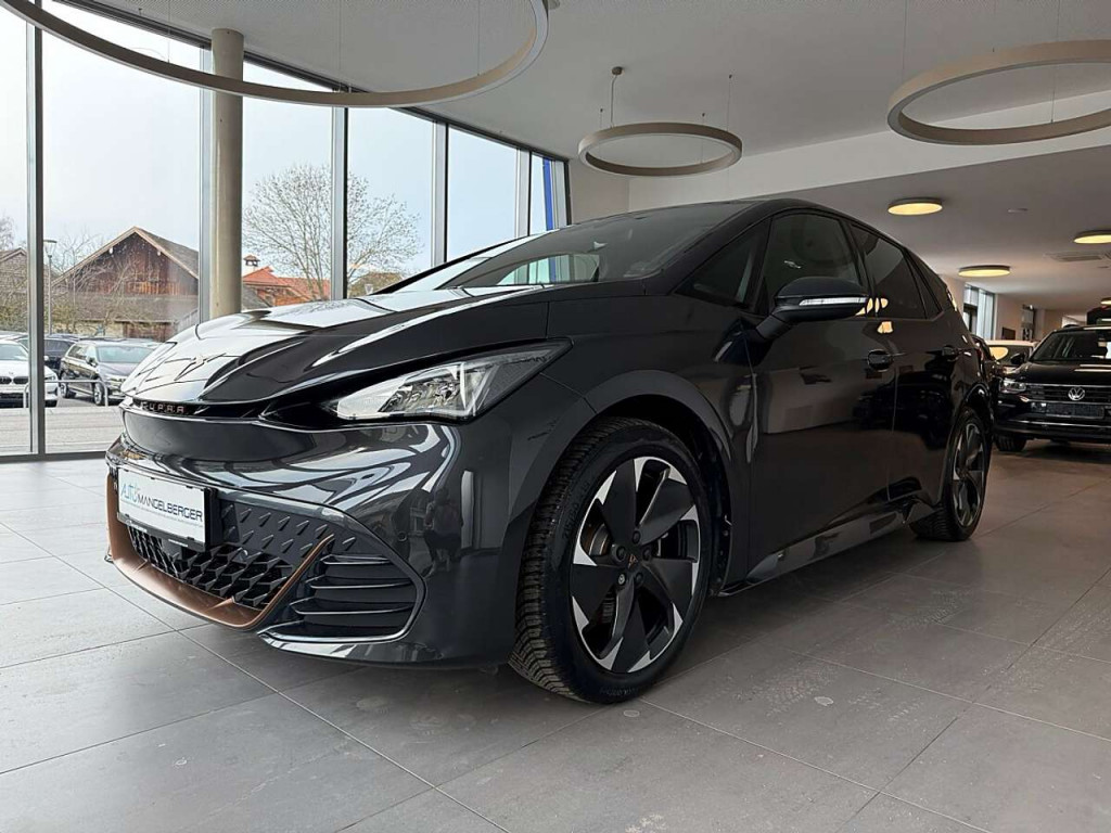 LM-Felgen 7,5x19 (Typhoon, schwarz / silber, glanzgedreht / Cupra Black), Metallic-Lackierung, Seitenscheiben ab 2.Sitzreihe und Heckscheibe dunkel getönt (Privacy Glass)7 Lautsprecher Abbiege- und Allwetterlicht Airbag Beifahrerseite abschaltbar Airbag Fahrer-/Beifahrerseite Akustischer Fußgängerschutz, Außensound (e-sound / AVAS) Ambiente-Beleuchtung LED Anti-Blockier-System (ABS) Antriebs-Schlupfregelung (ASR) Audiosystem mit Touchscreen-Farbdisplay Außenspiegel elektr. verstell-, heiz- und anklappbar mit Spiegelabsenkung und Welcome Light Blinkleuchten LED in Außenspiegel integriert Bluetooth-Schnittstelle mit Freisprecheinrichtung integriert Einparkhilfe vorn und hinten Elektromotor 150 kW (cont. 70 kW) Elektron. Stabilitätskontrolle (ESC) Fahrassistenz-System: Fahrprofilauswahl (CUPRA Drive Profile) Fahrassistenz-System: Müdigkeitserkennung Fahrassistenz-System: Spurhalteassistent Fahrassistenz-System: Umfeldbeobachtungssystem (Front assist) mit City-Notbremsfunktion Fensterheber elektrisch vorn + hinten mit Komfortschaltung Frontkamera Fußraumbeleuchtung LED Geschwindigkeits-Begrenzeranlage Getriebe für Elektrofahrzeug Heckleuchten Voll-LED mit dynamischem Lichtband (Infinite Light) Heckspoiler Wagenfarbe (Dachspoiler) HV-Batterie 62 kWh brutto / 58 kWh netto Innenspiegel mit Abblendautomatik Isofix-Aufnahmen für Kindersitz an Beifahrersitz und Rücksitz (inkl. i-Size-Kindersitze) Karosserie: 5-türig Klimaanlage Climatronic 2-Zonen Kombiinstrument digital (virtual cockpit) Kopf-Airbag-System Ladekabel mit Schukostecker Ladeleistung HV-Batterie 11 kW (Wechselstrom AC) Lenkrad heizbar (Sport/Leder) mit Multifunktion und Schaltfunktion Licht- und Regensensor Mittelarmlehne vorn Mobile Online Dienste Full Link Notrufsystem Parkbremse elektrisch Pedale Aluminium-Design Progressivlenkung Radioempfang digital (DAB+) Reifen-Reparaturset Reifenkontroll-Anzeige Rücksitzlehne geteilt/klappbar (1/3-2/3) Scheinwerfer Voll-LED Schnellladevorrichtung (CCS-Ladedose) Seitenairbag Seitenairbag vorn mitte (Central Airbag) Servolenkung elektro-mechanisch Sitz vorn links höhenverstellbar Sitzbezug / Polsterung: Stoff Sonnenblende links mit Spiegel (beleuchtet) Sonnenblende rechts mit Spiegel (beleuchtet) Sport-Fahrwerk Sport-Schalensitze vorn mit integrierten Kopfstützen Sprachsteuerungs-System USB-Schnittstelle vorn (2-fach, Typ C) Warnanlage für Sicherheitsgurt-System Wegfahrsperre (elektronisch) Wärmeschutzverglasung Zentralverriegelung / Startanlage Keyless Go (Start-Stop-Knopf)
