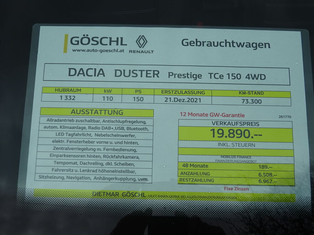 Perfekter Dacia Duster Prestige Allrad, tolle Motorisierung, mit üppiger Ausstattung wie Frontbügel, Anhängervorrichtung abnehmbar, doppelter Ladeboden, Kofferraumwanne, Trenngitter, neue Allwetterreifen, weiters autom. Klimaanlage Navigation Radio DAB+, USB Bluetooth, Sitzheizung vorne uvm.12 Monate Gebrauchtwagen-Garantie,