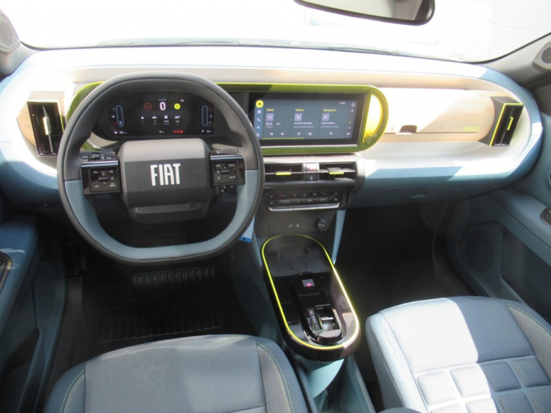 DER NEUE FIAT GRANDE PANDA HYBRID!! TOP VERSION LA PRIMA!! INKL. SITZHEIZUNG + LENKRADHEIZUNG!!AUSSTATTUNG:17 Leichtmetallräder Bicolore, Abgedunkelte Seitenscheiben− B und C-Säule in Glanzschwarz, Dachreling in Silver Metal,Stoßfänger mit optischem Unterfahrschutz in Silber,2 USB-C Anschlüsse hinten, Integriertes Navigationssystem, Kabellose Smartphone-Ladestation,Armaturenbrett mit Bambusfaser und Bambox,Automatisch abblendbarer Innenspiegel,Beifahrersitz höhenverstellbar,Kofferraumbeleuchtung,LED-Innenraumleuchten,Lenkrad mit hochwertigem Soft-Touch Bezug,Mittelarmlehne vorne,Polsterung La Prima in Bicolore Blau / Weiß mit gelben Nähten,Rückbank geteilt umklappbar 60/40,Staufächer in den Rückenlehnen der Vordersitze.
