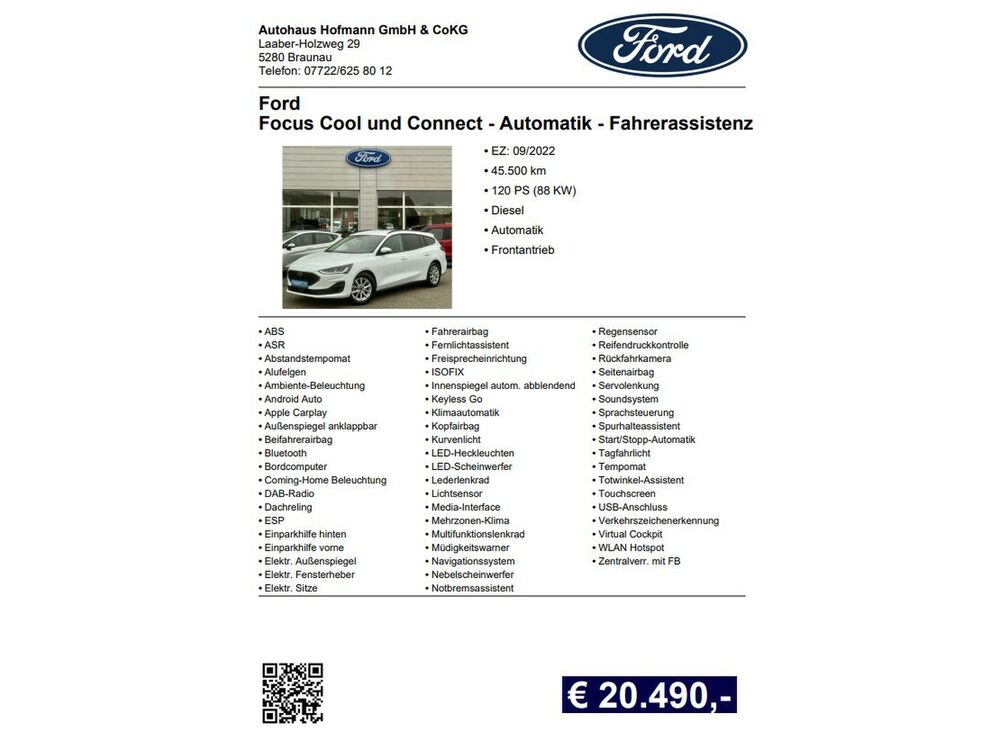 Außenspiegel Wagenfarbe, Chromeinfassung Seitenscheiben, Dachhimmel Stoff, Dimmer Instrumentenbeleuchtung, Elektr. Bremskraftverteilung (EBD), Fahrassistenz-System: Pre-Collision-System, Fahrassistenz-System: Auffahrwarnsystem, Gepäckraumabdeckung / Rollo, Heckscheibenwischer, Intelligent Protection System (IPS), 3-Punkt-Sicherheitsgurt hinten, Gurtstraffer, Intelligenter Geschwindigkeits-Begrenzer, Geschwindigkeits-Begrenzeranlage, Kopfstützen hinten mechan. verstellbar (3 Stück), Kopfstützen vorn 4-fach verstellbar, Laderaumboden verstellbar, Lenksäule (Lenkrad) höhen-/längsverstellbar, Mittelkonsole Premium, Mittelarmlehne vorn mit Staufach und 12V-Anschluß, Getränkehalter vorn, Modellpflege, Parkbremse elektrisch mit Auto-Hold-Funktion, Parkpilotsystem vorn und hinten, Parkpilotsystem hinten, Reifen-Reparaturkit, Schadstoffarm nach Abgasnorm Euro 6d, Schalt-/Wählhebelgriff Leder, Schaltpunktanzeige, Sitz vorn links höhenverstellbar, Lendenwirbelstütze Sitz vorn links, Sitz vorn rechts höhenverstellbar, Lendenwirbelstütze Sitz vorn rechts, Sitzbezug / Polsterung: Stoff, Sonnenblende links mit Spiegel, Sonnenblende rechts mit Spiegel, Steckdose (12V-Anschluß) im Koffer-/Laderaum, Stoßfänger Wagenfarbe, Warnanlage für Sicherheitsgurte hinten, Warnanlage für Sicherheitsgurte vorn, Zylinderabschaltung, Audiobedienung am Lenkrad, 6 Lautsprecher, Fahrassistenz-System: Sicherheitssystem SYNC mit automatischem Notruf, Ford SYNC 3 mit Navigation, Farbdisplay (8 Zoll), Ergonomiesitze vorn, Kopfstützen vorn 4-fach verstellbar, Fahrassistenz-Paket 2, Bodenleuchte im Außenspiegel, Fahrassistenz-System: Falschfahrer-Warnfunktion, Fahrassistenz-System: Verkehrsschildassistent, Fahrassistenz-System: Stauassistent inkl. Stop&Go-Funktion, Fahrassistenz-System: Ausweich-Assistent (Evasive Steer Assistance, ESA), Fahrassistenz-System: Intelligent Drive Assist, teilautomatisierte Fahrassistenz, Fahrassistenz-System: Fahrspur-Pilot, FordPass Connect inkl. eCall, Gepäckraum-Abtrennung (Netz), KeyFree-System, Innenraumfilter: Staub- und Pollenfilter, Sonderlackierung Frost-Weiß, Verglasung hinten abgedunkelt (Privacy Glass)Fahrzeugbeschreibung