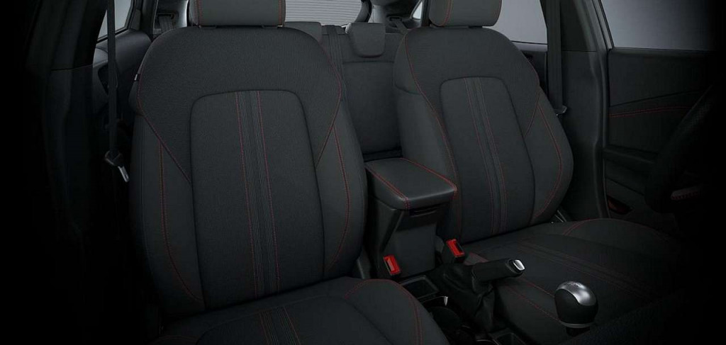 -Stoffpolsterung in Anthrazit mit Ziernähten in Rot