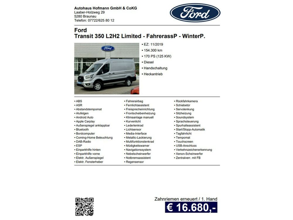 Ablage im Dachhimmel Fahrerhaus, Anhänger-Stabilisierungs-Programm (TSA), Bodenbelag: Vinyl im Lade-/Fahrgastraum, Einstiegsleuchten, Elektr. Bremskraftverteilung (EBD), Heckflügeltüren (Öffnungswinkel 180 Grad), Heizung mit Umluftschaltung, Karosserie/Aufbau: Kasten Hochraum Standard, Karosserievariante: Mittelhohes Dach, Lenksäule (Lenkrad) höhen-/längsverstellbar, My Key (2. Fahrzeugschlüssel programmierbar), Parkpilotsystem vorn und hinten, Radstand 3300 mm, Reifen-Reparaturkit, Schadstoffarm nach Abgasnorm Euro 6d-TEMP, Schalt-/Wählhebelgriff Leder, Scheibenwischer mit Intervallschaltung, regulierbar, Schmutzfänger hinten, Seitenschutzleisten, Trend, Trittstufe hinten integriert, Verkleidung im Lade-/FG-Raum: hoch, Verkleidung im Lade-/FG-Raum: Vinyl, Wankneigungskontrolle (Roll Stability Control, RSC), Zweiter Schlüssel mit Fernbedienung klappbar, Audio-/Radio-Fernbedienung am Lenkrad, Radiovorbereitung, 4 Lautsprecher, Fahrassistenz-System: Notrufsystem, FordPass Connect inkl. eCall, Fzg. ohne Bodenbelag Vinyl im Lade-/Fahrgastraum, Kaltstart-Paket, 2. Batterie, Laderaumleuchte LED, Parksensoren seitlich, Sicht-Paket 3, Scheinwerfer-Assistent mit Tag-/Nachtsensor, Außenleuchten hinten oben LED, Parkpilotsystem vorn und hinten, Frontscheibe heizbar, Sitze im Fahrerhaus: Fahrersitz mit Lendenwirbelstütze, Armlehne Fahrersitz, Spannungswandler 230V (Steckdose)Fahrzeugbeschreibung