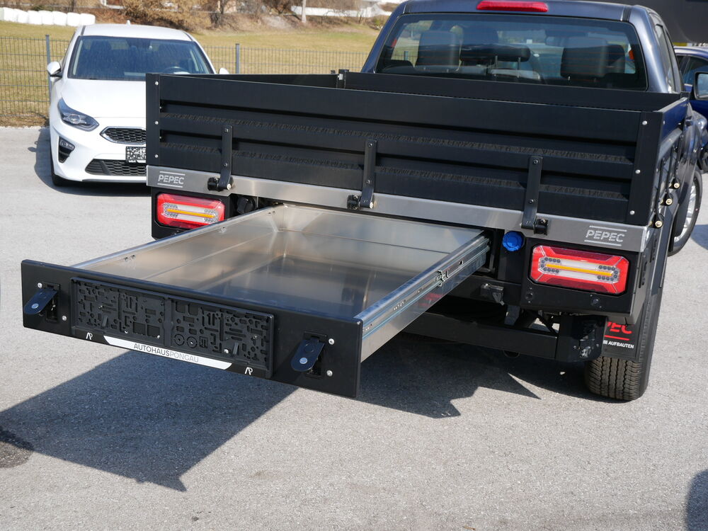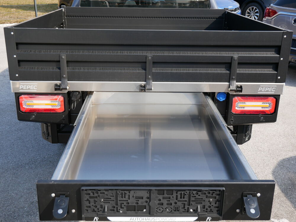 Alu Wechsleplateau mit 3 klappbaren Ladebordwänden zur Ladungssicherung. Inkl. seitlichen Toolboxen & Heckauszug, Airline Verzurrschienen & Verzurrpunkte.