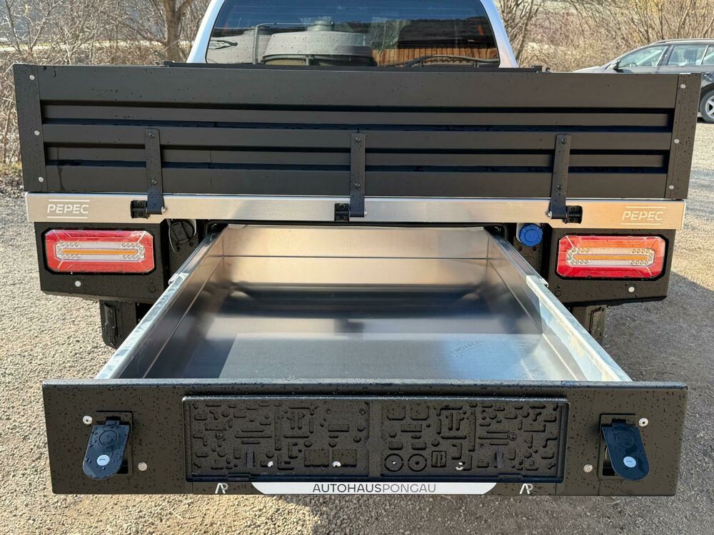 Das Fahrzeug verfügt über ein Alu Wechselplateau mit 3 klappbaren Ladebordwänden zur Ladungssicherunginkl. seitlichen Toolboxen und Heckauszug, Airline Verzurrschienen und Verzurrpunkte.