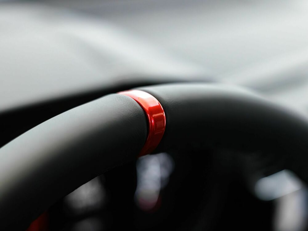Heizbares Sportlenkrad in Leder mit dunkelverchromtem Rahmen und rotem Marker