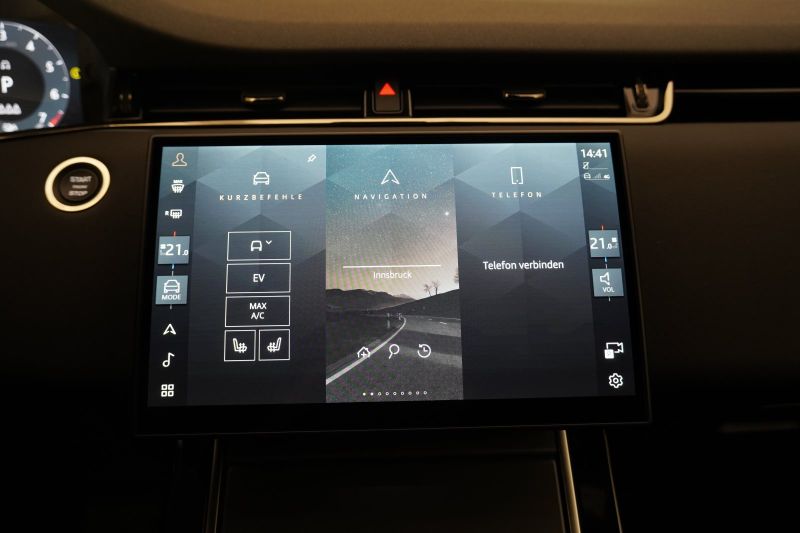 Ambiente-Beleuchtung, Audiosystem: Land Rover Sound-System (140 Watt, 6 Lautsprecher), Außenspiegel elektr. verstell-, heiz- und anklappbar, mit Abblendautomatik und Umfeldleuchte, Bluetooth-Schnittstelle, Einparkhilfe vorn und hinten, Fensterheber elektrisch vorn + hinten, Innenspiegel mit Abblendautomatik, Isofix-Aufnahmen für Kindersitz, Klimaautomatik 2-Zonen, Lenkrad mit Multifunktion und Einfassung in Moonlight, Lenkrad mit Schaltwippen/-tasten, Lenkrad mit Schaltwippen/-tasten (Mattchrom), Mobiltelefon Schnittstelle mit kabelloser Ladefunktion, Navigationssystem Pro, Radioempfang digital (DAB+), Servolenkung elektrisch, Sitz vorn links elektr. verstellbar (14-fach, mit Memory), Sitz vorn rechts elektr. verstellbar (12-fach), Smartphone Schnittstelle (Apple CarPlay & Android Auto), Start/Stop-Anlage, Start-Stop-Knopf (Start/Stop-Anlage ohne Schlüssel), Touchscreen-Farbdisplay (10,2 Zoll), Touchscreen-Farbdisplay (11,4 Zoll), USB-Anschluss in Mittelkonsole, Zentralverriegelung mitFahrzeugbeschreibung
