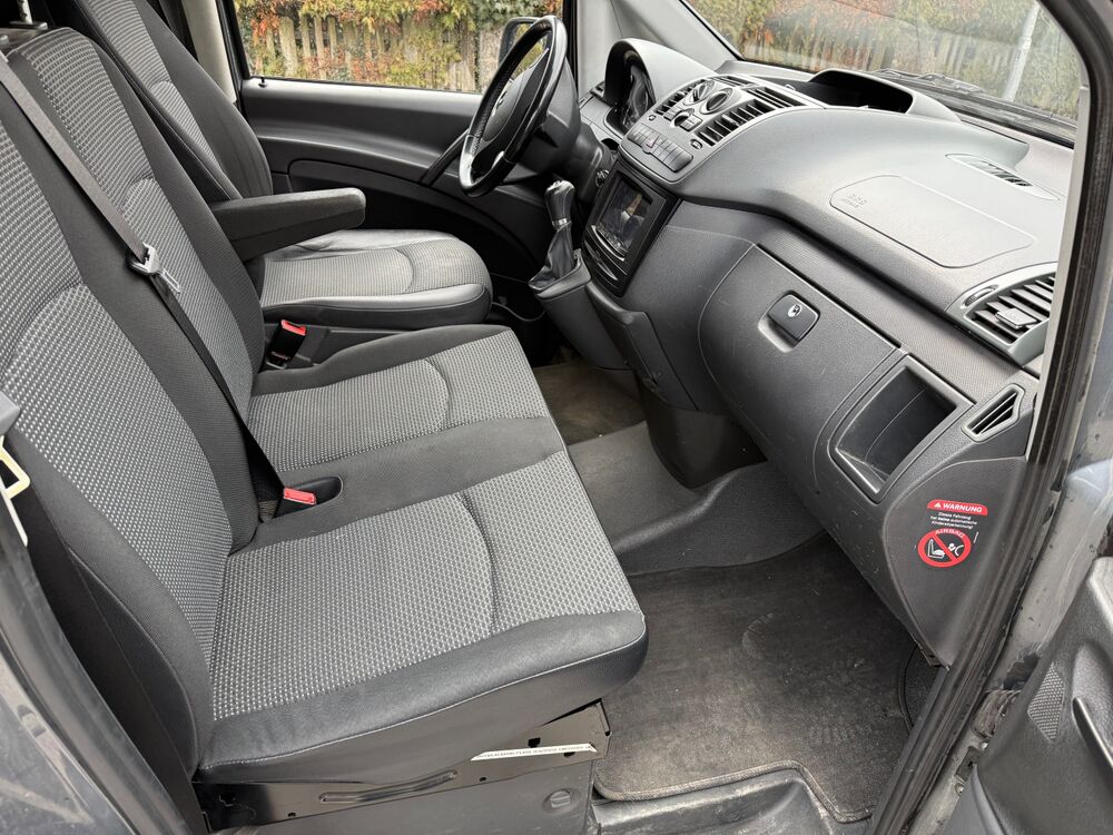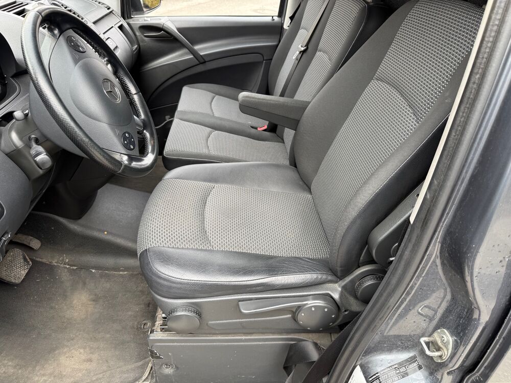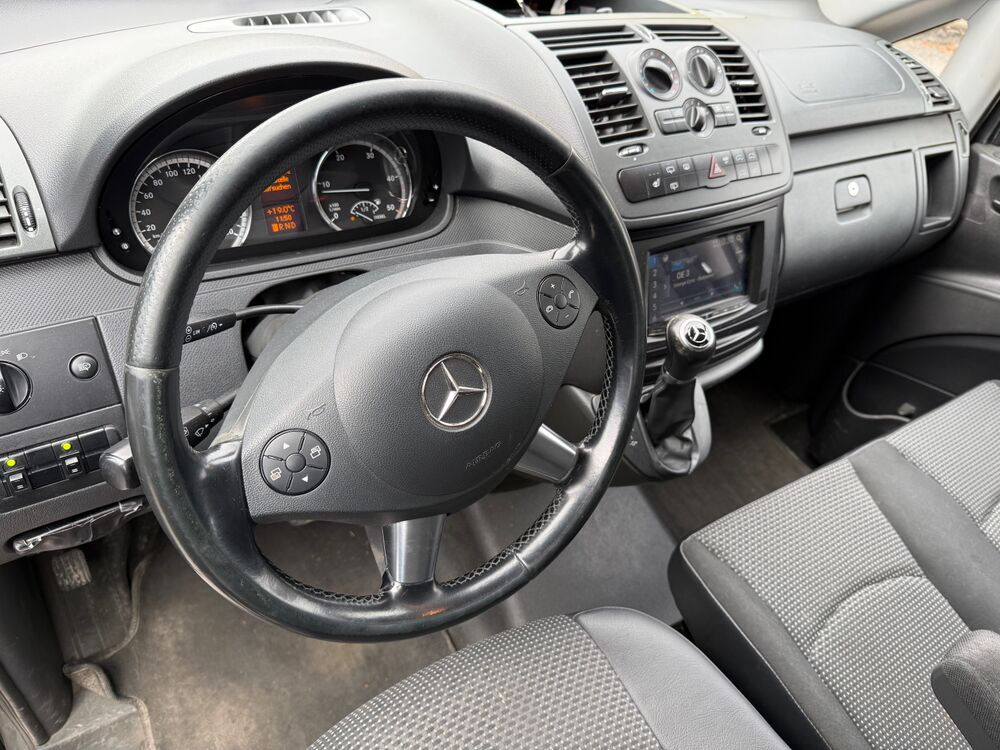 Adaptives Bremslicht, Ausführung: Vito Kasten, Außenspiegel asphärisch, beide, Frontscheibe mit Scheibenantenne, Generator 200 A, Heckklappe, Innenraumfilter: Pollenfilter, Karosserie/Aufbau: Kasten Standard, Karosserie/Aufbau: lang, Lenkrad (Lenksäule mech. verstellbar), LKW-Zulassung, Modellpflege, Radstand 3200 mm, Reifen-Reparaturkit mit Kompressor, Schadstoffarm nach Abgasnorm Euro 5, Sitzbezug / Polsterung: Stoff Lima, Stahlfelgen 6,5x16, BlueEfficiency-Paket, Fenster für hintere Türen / Heckklappe mit Wisch-/Waschanlage, Rückspiegel innen, Fenster im Lade-/FG-Raum: - feststehend, hinten, Fenster im Lade-/FG-Raum: - feststehend, vorn links, Fenster im Lade-/FG-Raum: - feststehend, vorn rechts, Fzg. ohne Laderaumtrennwand, Handschuhfach abschließbar, Holzfussboden im Laderaum, Außentemperaturanzeige, Radiovorbereitung, Radvollabdeckung, Reifen 205/65 R16C 103/101 T, Scheinwerfer-Reinigungsanlage (SRA), Anzeige für Waschwasserstand, Sicherheitsgurt-System mit Warnanlage (Fahrerseite), Sitzausstattung: Armlehne für Fahrersitz außen, Sitze im Fahrerhaus: Beifahrerdoppelsitz, Sitze im Fahrerhaus: Fahrersitz Komfort, Steckdose (12V-Anschluß) im Lade-/Fahrgastraum, Stoßfänger und Stoßleisten seitlich lackiert, Vlies-Batterie 95 Ah, Zuheizer, Zweiwege Lautsprecher vornFahrzeugbeschreibung