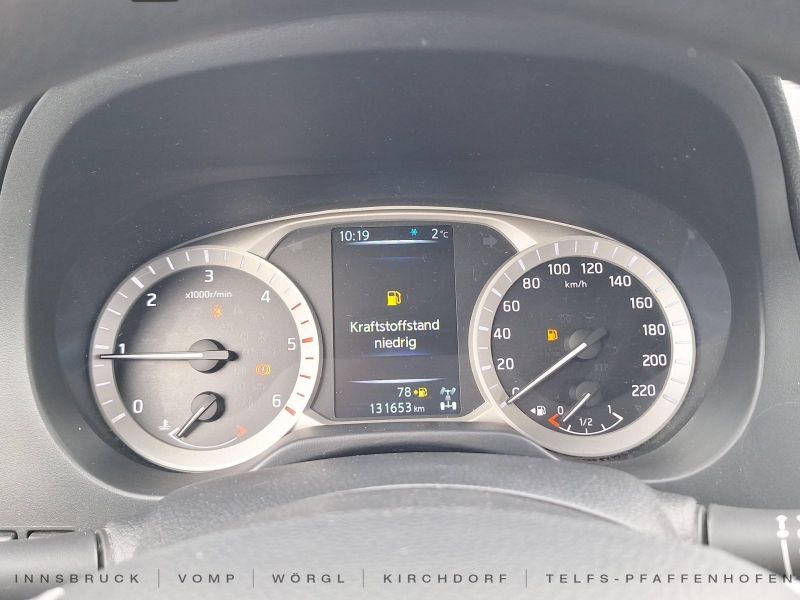 Klimaanlage, Airbag Beifahrerseite abschaltbar, Audiobedienung am Lenkrad, Audiosystem: Radio mit CD- und MP3-Player, Außenspiegel elektr. verstellbar, Außentemperaturanzeige, Fahrassistenz-System: Geschwindigkeits-Warnanlage akustisch (Speed-Limiter), Fahrer-Informations-System (FIS) mit Farbdisplay, Fensterheber elektrisch vorn, Freisprechanlage Bluetooth, Geschwindigkeits-Regelanlage (Tempomat), Isofix-Aufnahmen für Kindersitz, Mittelarmlehne vorn, Radioempfang digital (DAB), Sitz vorn links höhenverstellbar, Start/Stop-Anlage, USB-Schnittstelle, Airbag Fahrer-/Beifahrerseite, Anti-Blockier-System (ABS), Antriebsart: Allradantrieb, Automatische Fahrlichtschaltung, Bremsassistent (Nissan Brake-Assist), Differentialsperre mit begrenztem Schlupf, Elektron. Stabilitäts-Programm (ESP), Fahrassistenz-System: Berganfahr-Assistent, Kopf-Airbag-System, Tagfahrlicht, Reserverad in Fahrbereifung, 4 Lautsprecher, Außenspiegel heizbar, Außenspiegel mit Chromblende, Coming-Home-Lichtfunktion (FriFahrzeugbeschreibung