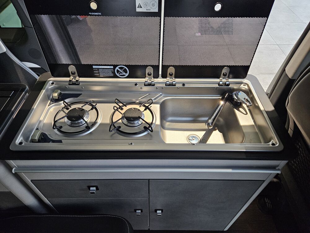 Küchenblock mit Gasherd und Waschplatz, Einbauschränke