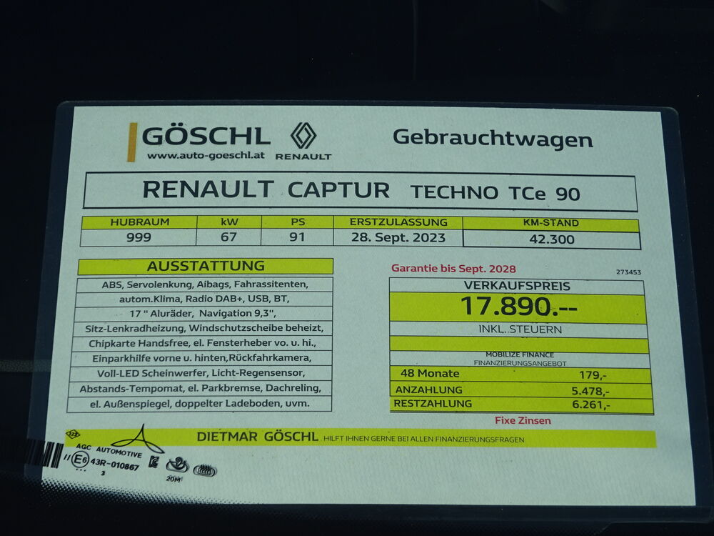 Jungwagen Renault Captur, spritziger sparsamer Turbo-Benziner, sehr gute Komfort- und Sicherheitsausstattung, Frontscheibenheizung, beheizte Vordersitze, Lenkradheizung, 9, 3" Navigation Easy Link, digitale Instrumente, Radio DAB+, 17" Alufelgen, LED Scheinwerfer uvm.Renault-Neuwagen-Garantie bis 27.09.2028.