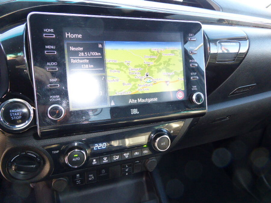 3. Bremsleuchte, Aktive Kopfstützen vorn, Anhänger-Stabilisierungs-Programm (TSC), 6 Lautsprecher, Farbmonitor, Außenspiegel schwarz lackiert, B-Säulen schwarz, Bodenwanne für Laderaum (Kunststoffausführung), Chromleisten an Seitenfenster unten, Innenausstattung: Dekoreinlagen / Armaturenbrett, schwarz, Invincible-Paket, Stoßfänger hinten schwarz, Türgriffe innen schwarz lackiert, Komfort-Fahrwerk, Kopfstützen hinten, Kühlergrill schwarz lackiert, mit Chromleiste, Lenksäule (Lenkrad) verstellbar, Leuchtweitenregelung automatisch, Mittelarmlehne hinten mit Getränkehalter, Modellpflege, Radstand 3085 mm, Reserverad in Fahrbereifung, Schadstoffarm nach Abgasnorm Euro 6d, Schalt-/Wählhebelgriff Leder, Schmutzfänger hinten, Schmutzfänger vorn, Sicherheitsgurte vorn höhenverstellbar, Sitz vorn links höhenverstellbar, Sonnenblende rechts mit Make-up-Spiegel, Steckdose (12V-Anschluß) in Mittelkonsole, Stoßfänger Wagenfarbe, Toyota Safety Sense, Fahrassistenz-System: Pre-Collision-System (PCS), Trittbretter seitlich, Türgriffe außen verchromt, Verteilergetriebe zweistufig (Untersetzungsgetriebe), Warnanlage für Sicherheitsgurte hinten, Warnanlage für Sicherheitsgurte vornFahrzeugbeschreibung