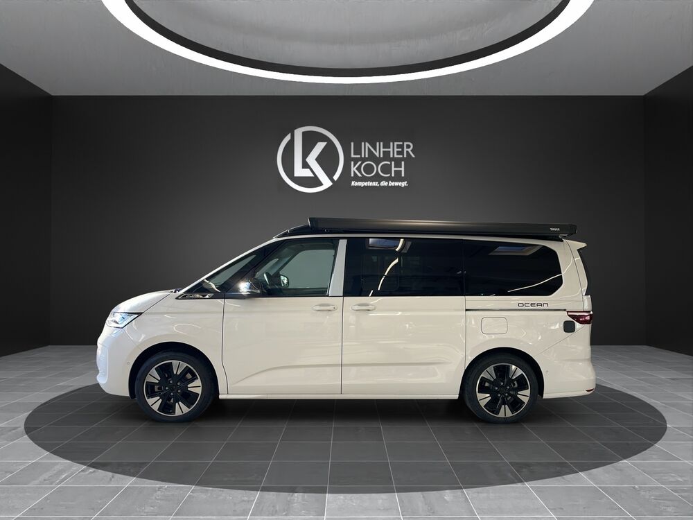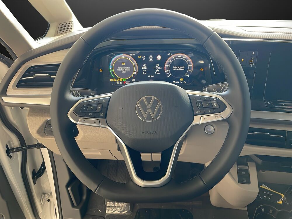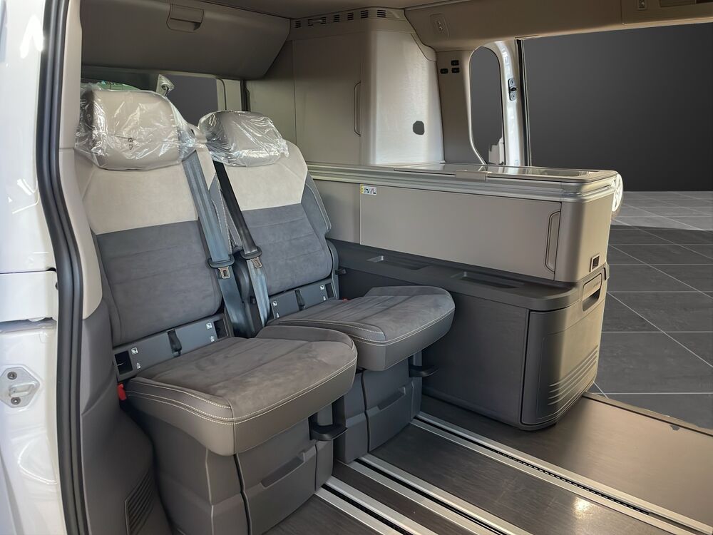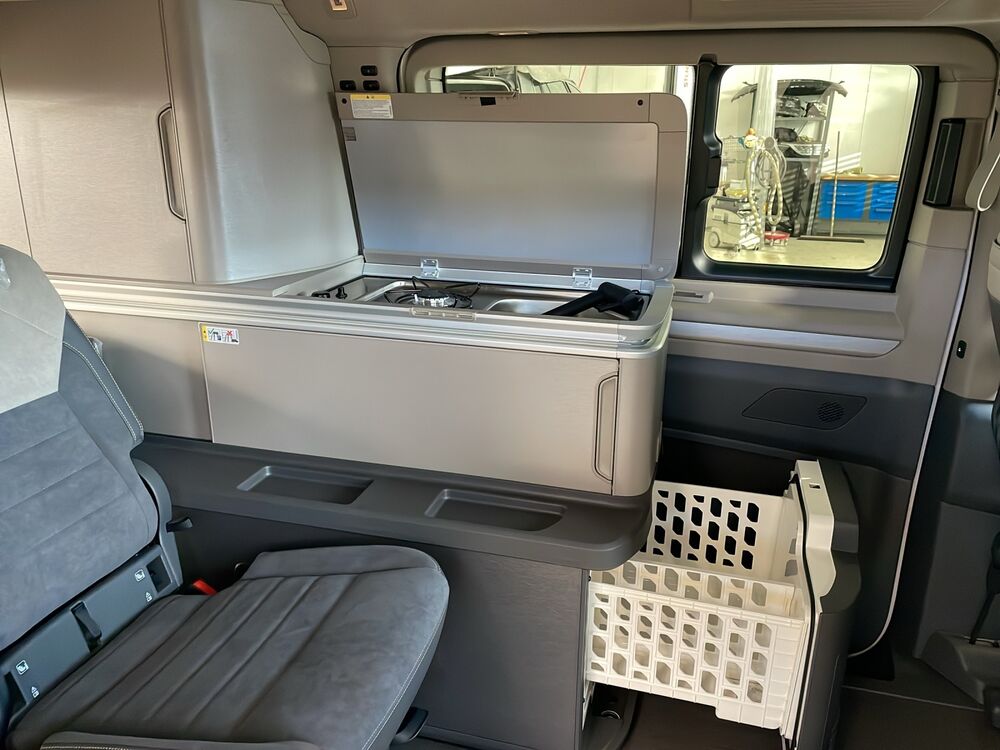 Außenspiegel schwarz lackiert, Bodenbelag im Lade-/Fahrgastraum Kunststoff, Digital Cockpit Pro (Instrumentenanzeige Digital), Fahrassistenz-System: Ausweich-Assistent und Abbiege-Assistent, Fenster im Lade-/FG-Raum: - schiebbar, vorn rechts, Fliegengitter Schiebefenster links, Fliegengitter Schiebefenster rechts, Frontscheibe Verbundglas getönt, Funkschlüssel (2), Handschuhfach beleuchtet, Heckklappe mit Verglasung und Zuziehhilfe, Innenausstattung: Dekoreinlagen Dark Silver brushed, Innenbeleuchtung an Aufstelldach, Heckklappe und Sommerküche (Coast / Ocean), Lautsprecher (8), Leuchtweitenregelung, Markisenleisten schwarz, Mobile Online Dienste Vorbereitung We Connect und We Connect Plus, Nichtraucher-Paket, Radstand 3124 mm, Reifen-Reparaturkit, Schadstoffarm nach Abgasnorm Euro 6e, Scheibenwischer mit Intervallschaltung, regulierbar, Schubladen unter Außensitze im Fahrerraum und Fahrgastraum und 2 Abfallbehälter, Sicherheitsgurte vorn mit Gurtstraffer und Endbeschlagstraffer, höhenverstellbar, Sitzausstattung: 4-Sitzer, Sitzbezug / Polsterung: Stoff Melange, Sitze im Fahrerhaus: Beifahrersitz höhenverstellbar, Sitze im Fahrerhaus: Fahrersitz höhenverstellbar, Sitze im Lade-/FG-Raum: 2.Reihe, 2 Einzelsitze, Sonnenblenden mit Spiegel (beleuchtet), Steckdose 230V (mit Einspeisung für Batterieaufladung), Steckdose 230V im Fahrerhaus, Vorbereitung für Alkohol-Wegfahrsperre (Alcolock), Warnanlage für Sicherheitsgurte vorn und hinten, Zierleiste zwischen Scheinwerfern: schwarz lackiert und Chromleisten, Zul. Gesamtgewicht 2,95 t, Fahrassistenz-System: Fahrprofilauswahl, Lackierung: 2-Farben-Lackierung Candy-weiss uni / Deep Black Perleffekt, Markise (Gehäuse und Markisenleisten schwarz, links), Park-Paket AdvancedFahrzeugbeschreibung