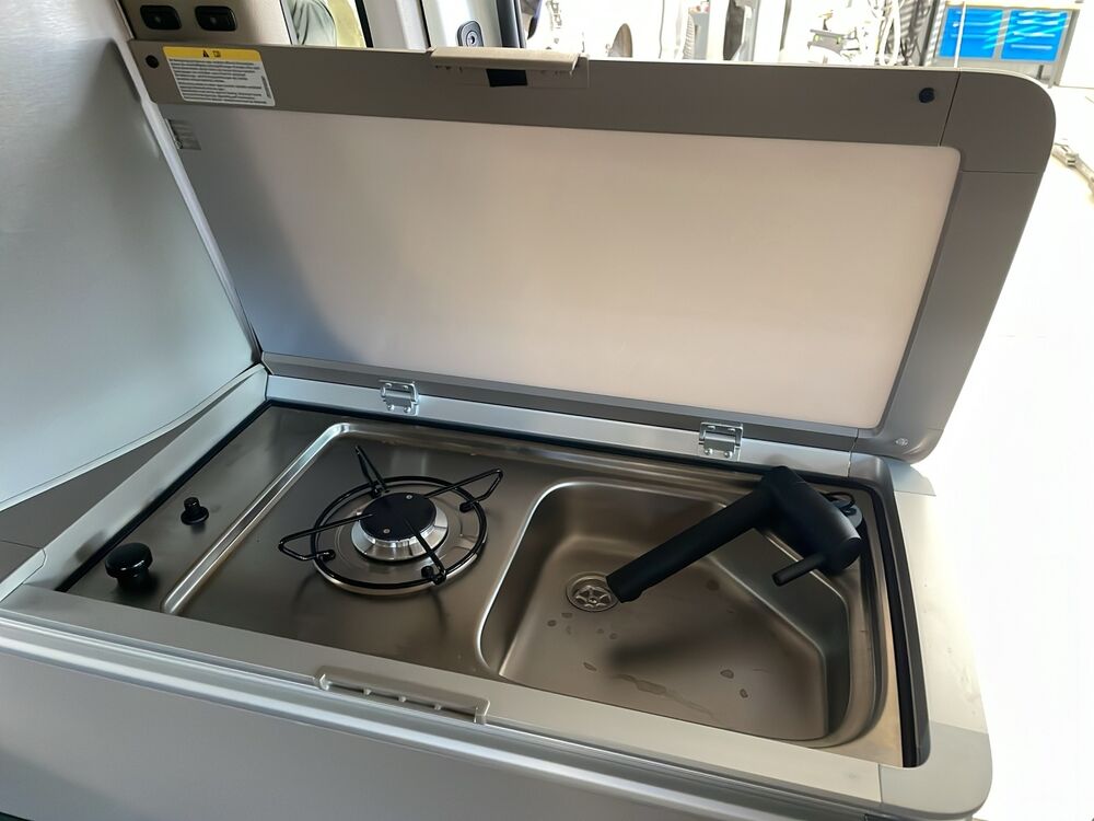 - mit Außenklapptisch und 230-Volt-Steckdose zum Kochen