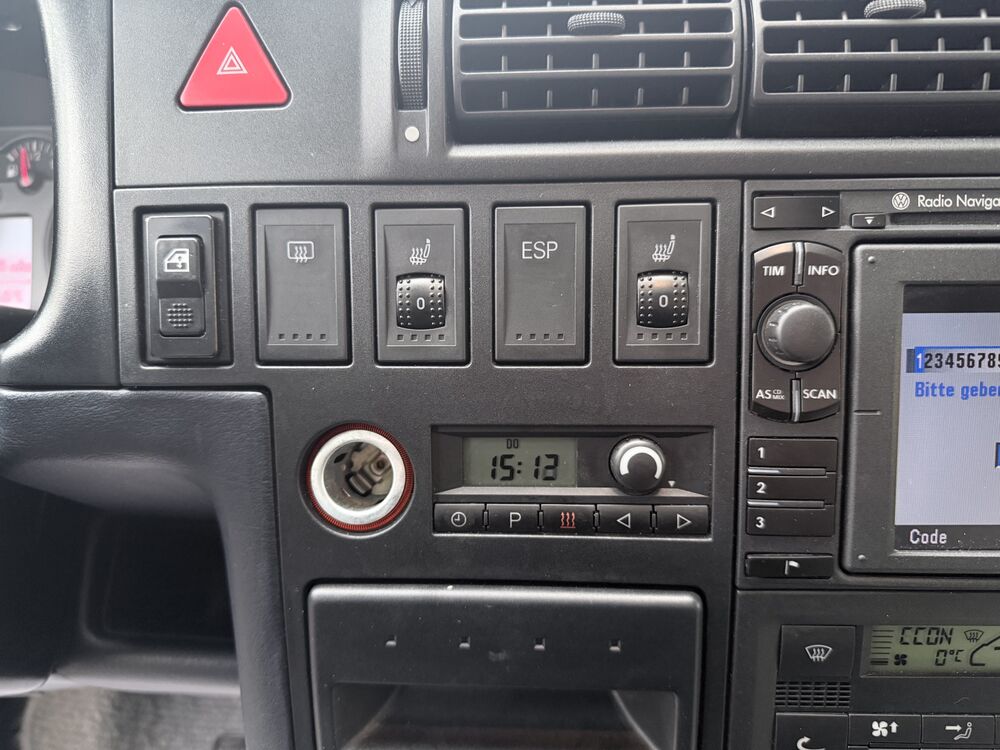 Außenspiegel asphärisch, links, Außenspiegel konvex, rechts, Bremsscheiben hinten 15" (280 mm x 12 mm), Bremsscheiben innenbelüftet, Doppeltonfanfare, Drehzahlmesser, Fahrwerk 15", Fenster im Lade-/FG-Raum: - feststehend, vorn links, Fenster im Lade-/FG-Raum: - feststehend, vorn rechts, Festsattel-Scheibenbremse, Frontscheibe Verbundglas, Generator: Bosch, Heckscheibe heizbar, Heckscheibenwischer, Karosserie/Aufbau: Bus, Karosserievariante: Normaldach, Kältemittel R 134 A, Leuchtweitenregelung, Make-up-Spiegel rechts, Nebelschlussleuchte, Reifen 205/65 R15C 102/100 T, Rückfahrscheinwerfer, Scheibenwaschdüsen beheizt, Scheinwerfer H4, Sitzanordnung 2-2-3, Sitzbezug / Polsterung: Stoff, Sitze im Lade-/FG-Raum: 1.Reihe, 2er-Sitzbank, Sitze im Lade-/FG-Raum: 2.Reihe, 3er-Sitzbank, Stahlfelgen 6x15, Zusatzbremsleuchte, 2. Batterie, Armaturentafel gepolstert, Frontscheibe mit Scheibenantenne, Drehzahlmesser, Batterie 80 Ah, Bodenbelag im Fahrerhaus: Gummi, Bodenbelag im Lade-/Fahrgastraum Gummi, Bremsscheiben vorn 15" (280 mm x 24 mm), Bremsscheiben innenbelüftet, Elektron. Stabilitäts-Programm (ESP), Stabilisator hinten, Frontscheibe Dämmglas, Frontscheibe mit Scheibenantenne, Generator 150 A, Getriebe Automatik - (4-Stufen), Fahrwerk 15", Longlife-Service, Luftfilter: Staubschutz Luftfilter, Motor 2,5 Ltr. - 75 kW TDI KAT (AUF), Radstand 3320 mm, Fahrwerk 15", Reserverad in Fahrbereifung, Scheinwerfer-Reinigungsanlage (SRA), Sitze im Fahrerhaus: Fahrer- und Beifahrersitz mit Armlehnen vorn, Sitze im Fahrerhaus: Lendenwirbelstütze Beifahrersitz, Sitze im Fahrerhaus: Lendenwirbelstütze Fahrersitz, Stabilisator hinten, Stoßfänger lackiert, Stoßfänger lackierfähigFahrzeugbeschreibung