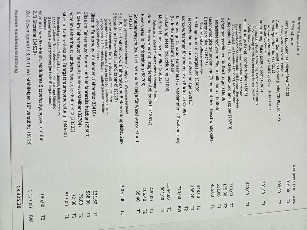 Außenspiegel konvex, links, Außenspiegel konvex, rechts, Bodenbelag im Fahrerhaus: Gummi, Bordwerkzeug, Deaktivierungsschalter für Antriebs-Schlupfregelung (ASR), Fahrassistenz-System: Berganfahr-Assistent, Fenster im Lade-/FG-Raum: - feststehend, vorn und hinten links, Fenster im Lade-/FG-Raum: - feststehend, vorn und hinten rechts, Frontscheibe Verbundglas, Funkschlüssel (2) klappbar, Handschuhfach abschließbar, Handschuhfach beleuchtet, Innenleuchten im Lade-/FG-Raum: LED, Innenraumfilter: Pollenfilter, Karosserie/Aufbau: Kombi Standard, Karosserievariante: Normaldach, Kraftstofftank: 70 Ltr., Kühlergrill mit Chromleisten, Lenksäule (Lenkrad) verstellbar, Nichtraucher-Paket, Radstand 3400 mm, Schadstoffarm nach Abgasnorm Euro 6d-TEMP, Sitzbezug / Polsterung: Stoff, Warnanlage für Sicherheitsgurt (Fahrerseite), Anhänger-Stabilisierungs-Programm, Multimedia-Schnittstelle 2 x USB (Typ C) vorn, Mobile Online Dienste App-Connect, Ausstattungs-Paket Licht + Sicht, Automatische Fahrlichtschaltung, Ausstattungs-Paket: Komfort-Paket, Haltegriffe A-Säulen, Innenleuchten im Fahrerhaus: Leseleuchte vorn, Sonnenblenden mit Spiegel, Steckdosen (12V-Anschluß) im Fahrerhaus (2 Stück), Abfallbehälter, Befestigungsschienen für Dachträger, Geschwindigkeits-Begrenzeranlage, Heckflügeltüren mit Verglasung, Heckscheibe heizbar, mit Wischanlage, Multifunktionsanzeige Plus, Reserverad in Fahrbereifung, Scheibenwaschdüsen beheizt und Anzeige für Waschwasserstand, Scheibenwaschdüsen beheizt, Anzeige für Waschwasserstand, Sitz-Paket: 9-Sitzer, 3-3-3 (Fahrersitz und Beifahrerdoppelsitz, 2er-Sitzbank und Einzelsitz, 3er-Sitzbank), Sitze im Fahrerhaus: Beifahrerdoppelsitz mit Staufach (abschließbar) im Sitzkasten, Sitze im Lade-/FG-Raum: 1.Reihe, 2er-Sitzbank + 1 Einzelsitz, Sitze im Lade-/FG-Raum: 2.Reihe, 3er-Sitzbank (Wickelfeder), Sitze im Fahrerhaus: Armlehnen, Fahrersitz, Sitze im Fahrerhaus: Fahrersitz höhenverstellbar, Sitze im Fahrerhaus: Lendenwirbelstütze Fahrersitz, Sitze im Lade-/FG-Raum: Fahrgastraumvorbereitung I, Bodenbelag im Lade-/Fahrgastraum Gummi, Innenleuchten im Lade-/FG-Raum: Trittstufenleuchten, Zuheizer, Sitze im Lade-/FG-Raum: Modulares Sitzbefestigungssystem für 2./3.Sitzreihe, Zul. Gesamtgewicht 3,20 t (inkl. Stahlfelgen 16" verstärkt)Fahrzeugbeschreibung