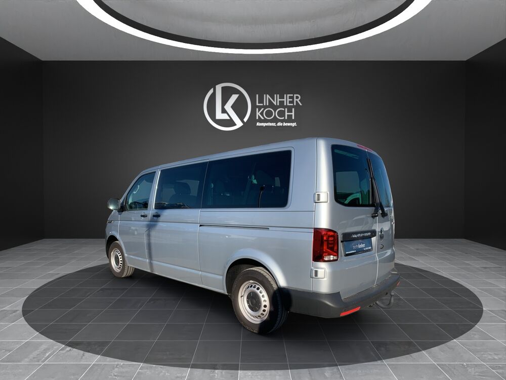 Außenspiegel konvex, links, Außenspiegel konvex, rechts, Bodenbelag im Fahrerhaus: Gummi, Bordwerkzeug, Deaktivierungsschalter für Antriebs-Schlupfregelung (ASR), Fahrassistenz-System: Berganfahr-Assistent, Fenster im Lade-/FG-Raum: - feststehend, vorn und hinten links, Fenster im Lade-/FG-Raum: - feststehend, vorn und hinten rechts, Frontscheibe Verbundglas, Funkschlüssel (2) klappbar, Generator verstärkt, Handschuhfach abschließbar, Handschuhfach beleuchtet, Innenleuchten im Lade-/FG-Raum: LED, Innenraumfilter: Pollenfilter, Karosserie/Aufbau: Kombi, Karosserievariante: Normaldach, Kraftstofftank: 70 Ltr., Kühlergrill mit Chromleisten, Lenksäule (Lenkrad) verstellbar, Nichtraucher-Paket, Radstand 3400 mm, Schadstoffarm nach Abgasnorm Euro 6d, Sitzbezug / Polsterung: Stoff, Stahlfelgen 7x17, Warnanlage für Sicherheitsgurte (Fahrer-/Beifahrerseite), Anhänger-Stabilisierungs-Programm, Multimedia-Schnittstelle 2 x USB (Typ C) vorn, Mobile Online Dienste App-Connect, Ausstattungs-Paket Licht + Sicht, Automatische Fahrlichtschaltung, Ausstattungs-Paket: Komfort-Paket, Haltegriffe A-Säulen, Sonnenblenden mit Spiegel, Steckdosen (12V-Anschluß) im Fahrerhaus (2 Stück), Abfallbehälter, Fahrassistenz-System: Berganfahr-/Abfahr-Assistent, Frontscheibe heizbar, Fußmatten Fahrerhaus: Gummi, Geschwindigkeits-Begrenzeranlage, Heckflügeltüren mit Verglasung, Heckscheibe heizbar, mit Wischanlage, Notrufsystem, Reserverad in Fahrbereifung, Scheibenwaschdüsen beheizt und Anzeige für Waschwasserstand, Scheibenwaschdüsen beheizt, Anzeige für Waschwasserstand, Schriftzug Transporter am Kotflügel, Sitz-Paket: 9-Sitzer, 3-3-3 (Fahrersitz und Beifahrerdoppelsitz, 3 Einzelsitze, 3er-Sitzbank), Sitze im Fahrerhaus: Beifahrerdoppelsitz mit Staufach (abschließbar) im Sitzkasten, Sitze im Lade-/FG-Raum: 1.Reihe, 3 Einzelsitze, Sitze im Lade-/FG-Raum: 2.Reihe, 3er-Sitzbank (Wickelfeder), Sitze im Lade-/FG-Raum: Modulares Sitzbefestigungssystem für 2./3.Sitzreihe, Sitze im Fahrerhaus: Fahrersitz höhenverstellbar, Sitze im Fahrerhaus: Lendenwirbelstütze Fahrersitz, Sitze im Lade-/FG-Raum: Fahrgastraumvorbereitung I, Bodenbelag im Lade-/Fahrgastraum Gummi, Innenleuchten im Lade-/FG-Raum: Trittstufenleuchten, Zuheizer, Verglasung hinten abgedunkelt, Zul. Gesamtgewicht 3,20 t (inkl. Stahlfelgen 16" verstärkt)Fahrzeugbeschreibung